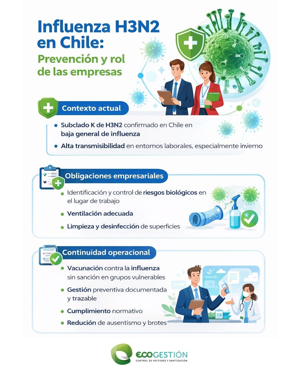 Desde la perspectiva de Ecogestión, la circulación de influenza A(H3N2) debe ser tratada como un riesgo biológico permanente dentro de la gestión empresarial, y no como un evento sanitario aislado. En Chile, los riesgos biológicos forman parte de las obligaciones del empleador en materia de seguridad y salud en el trabajo, conforme a la Ley 16.744, el DS N°594 y las instrucciones de la SUSESO y las mutualidades.